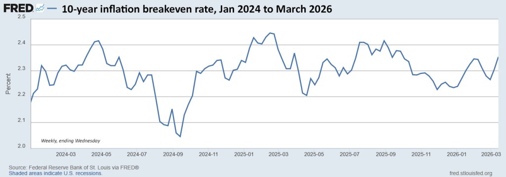 I have been assuming that inflation expectations would rise because of the current oil shock, but possibly not so much for 10 years out. This chart shows the 10-year inflation breakeven rate has increased 11 basis points since the outbreak of war.