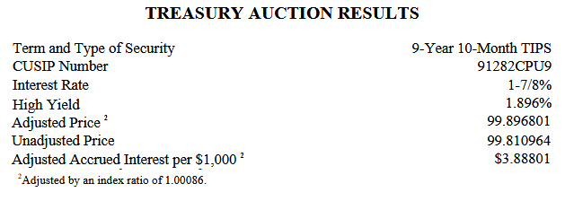If we assume the auction’s real yield will be 1.90% (things will change by Thursday) this TIPS is likely to auction at or near par value, since that yield is a bit above the coupon rate of 1.875%. The Bloomberg yields page shows a Friday closing price of 99.82. Plus, this TIPS will carry a minimal inflation index of 1.00086 on the settlement date of March 31. Let’s look at how that works out for a $10,000 par value investment: