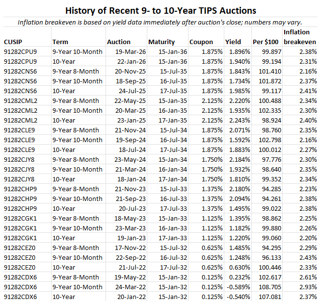 That’s the backdrop for Thursday’s Treasury auction of $19 billion in a reopened 10-year TIPS — CUSIP 91282CPU9 — creating a 9-year, 10-month TIPS. This TIPS had its originating auction Jan. 22, 2026, which generated a real yield to maturity of 1.940% and set its coupon rate at 1.875%.