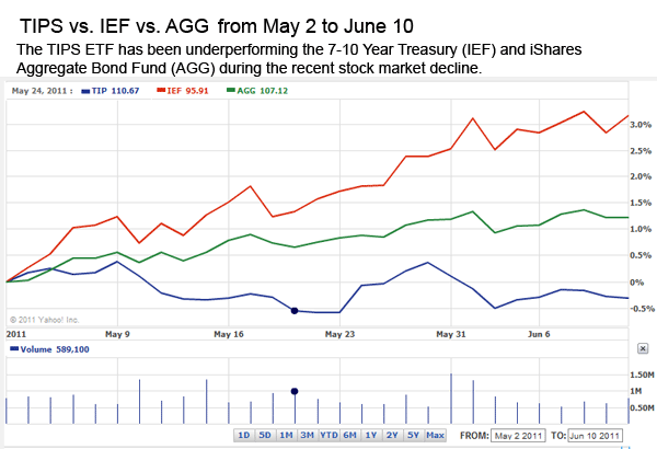 If the stock market is going down because of economic fears – as it has been over the last month – then TIPS may underperform other bond funds. The reason: The fear of inflation is dwindling.