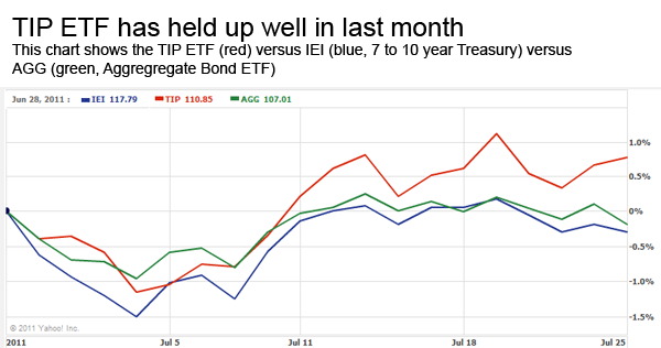 To gauge how TIPS are performing, I like comparing the TIP ETF, which holds U.S. Treasury Inflation-Protected Treasuries, with two other ETFs: IEI (which holds 7-10 year traditional Treasuries) and AGG (an aggregate corporate/Treasury bond fund that is basically a ‘total bond fund’).