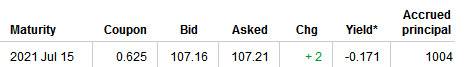 We don’t yet know the coupon rate, but it should be well below the 0.625% of the last new release of a 10-year TIPS, in July 2011. In the secondary market, that July TIPS is currently yielding -0.171%, as of Friday: