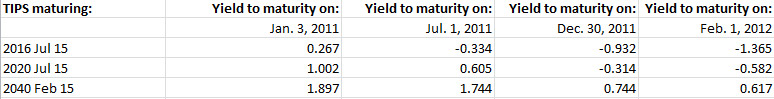 Treasury Inflation-Protected Securities had a quite a year in 2011, with the base interest rate dropping dramatically, especially in the second half of the year. This chart shows the deep drop in yields to maturity since Jan. 3, 2011: