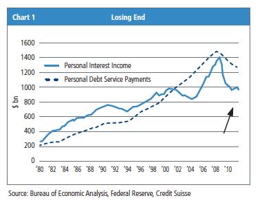 Gross presents this chart to show the destructive force of super-low interest rates on families with savings, who are now facing debt payments much higher than interest earned: