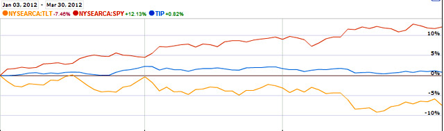 The Treasury ‘bear’ market. There are lots of news articles out this weekend pointing out that the Treasury market has taken a hit in 2012, for example: ‘Bonds limp to end worst quarter since 2010.’ And of course, stocks have done very well in the last three months.