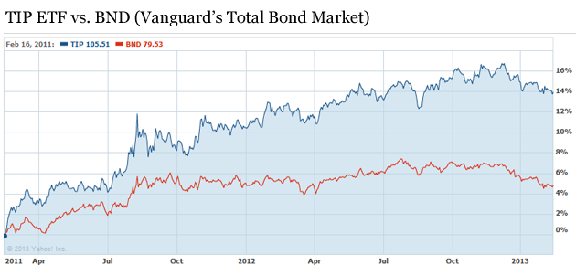 These two funds have similar durations, but the Total Bond Market has greatly lagged the returns of the TIP ETF over the last two years. By the way, the Federal Reserve began its market manipulation in mid 2011, and at that point the TIP ETF sharply changed course.