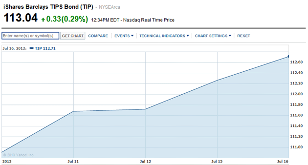 The result. Last Wednesday, by Treasury estimates, a 10-year TIPS was drawing a yield to maturity of 0.64%. Today, according to Bloomberg’s real-time estimates, that yield has fallen to 0.30%. That’s a fall of 34 basis points in 5 market days. Here is how jawboning looks in a 5-day chart for the TIP ETF (its price rises when its yield falls):