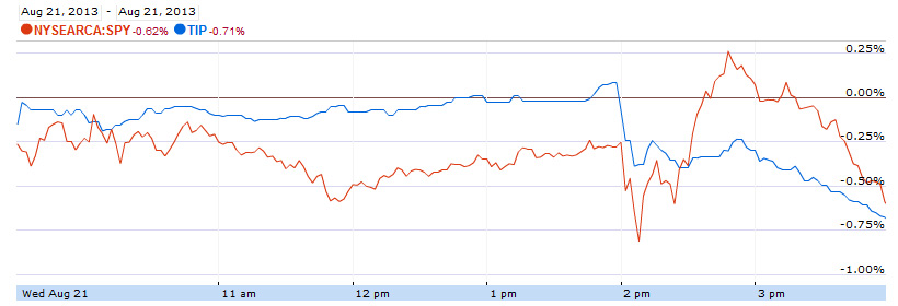 Both the stock market (depicted in red with the SPY ETF) and the TIPS market (in blue with the TIP ETF) took an immediate dive after the Fed minutes were released at 2 p.m. The stock market tried to rally, but fell back.