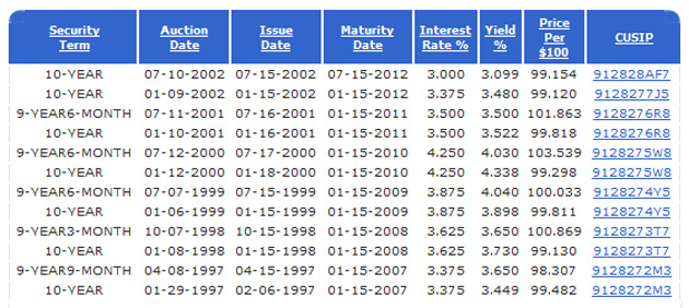 Improbable?  Sure the high end of that TIPS yield looks unlikely. But a 10-year TIPS paying 2.96% would not be an anomaly. In fact, every 9- or 10-year TIPS auction from 1997 to July 2002 had a yield higher than 2.96%: