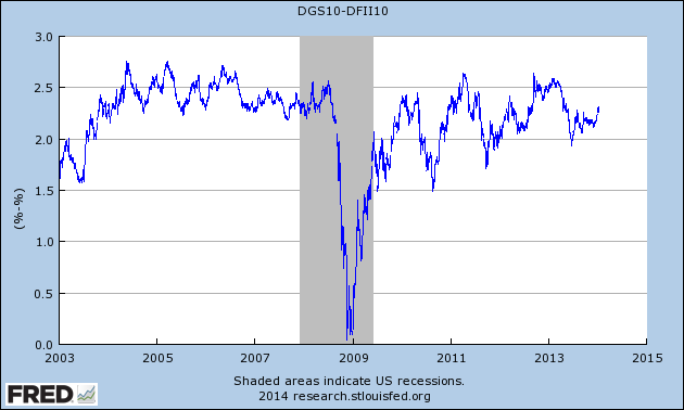 This chart pretty well shows the TIPS breakeven rate trading in the neutral zone: