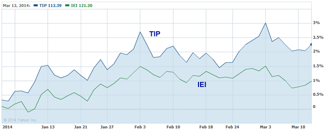 It’s also significant that TIPS have been out-performing Treasuries of similar terms. Take a look at this year-to-date chart for the TIP ETF versus IEI, an ETF holding intermediate-term Treasuries and having a similar duration: