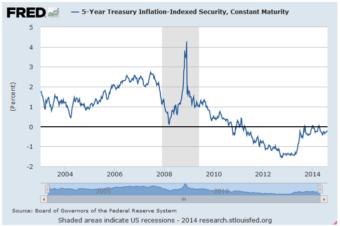 Here is a chart of 4- to 5-year TIPS auctions since 2007. Check it out and tell me if you can figure out what would pass for a ‘normal’ yield in 2014, minus Fed manipulation and simmering world turmoil: