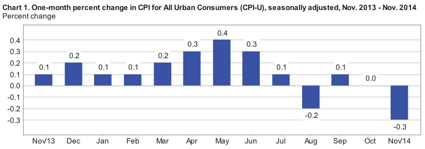 The Consumer Price Index for All Urban Consumers (CPI-U) declined 0.3% in November on a seasonally adjusted basis, the U.S. Bureau of Labor Statistics reported today. Over the last 12 months, the all items index – also called ‘headline inflation’ – increased 1.3%.