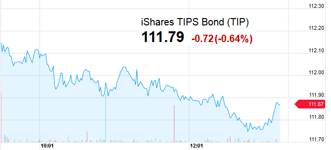 The broadly-based TIPS ETF (ticker TIP) had been declining all morning, indicating that yields were on the rise. Once the auction closed at 1 p.m., the TIP ETF made a move higher, which generally shows a positive reaction.