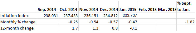 What this means for TIPS. January’s inflation index of 233.707 sets the TIPS principal adjustments through March 31, 2015. It means that accrued principal balances of all TIPS you own will be declining over the next two months. These balances go up with inflation and decline with deflation.