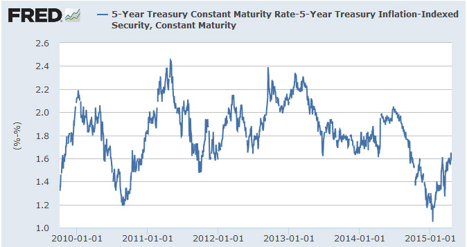 This chart shows the 5-year inflation breakeven rate since 2010, and shows that the 5-year TIPS have bounced off very low levels in recent months. The lower the breakeven rate, the ‘cheaper’ TIPS are against a nominal Treasury. It’s clear that TIPS are getting more expensive, and that indicates that inflationary fears are rising: