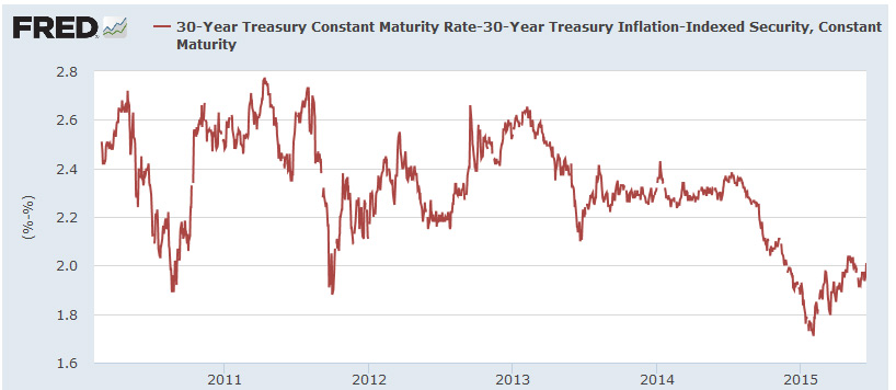 Back in February, this same TIPS auctioned with a breakeven rate of 1.89% — indicating that the market’s inflation expectations are rising. Here is a long-term chart of 30-year breakevens, showing that 2.0% remains on the low side of the scale: