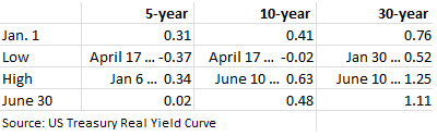The chart at the right shows highs and lows for the year for the three TIPS maturities available at auction. What’s interesting here is that yields have fallen on short-term TIPS while rising slightly for the 10-year and more sharply for the 30-year.
