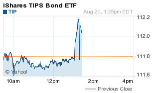 Reaction to the auction. The TIP ETF had been trading down (slightly) all morning but took a very large move up after the auction closed, indicating declining yields. In fact, Bloomberg’s Current Yields page is showing this same TIPS currently trading at 0.27%, lower than the auction yield.