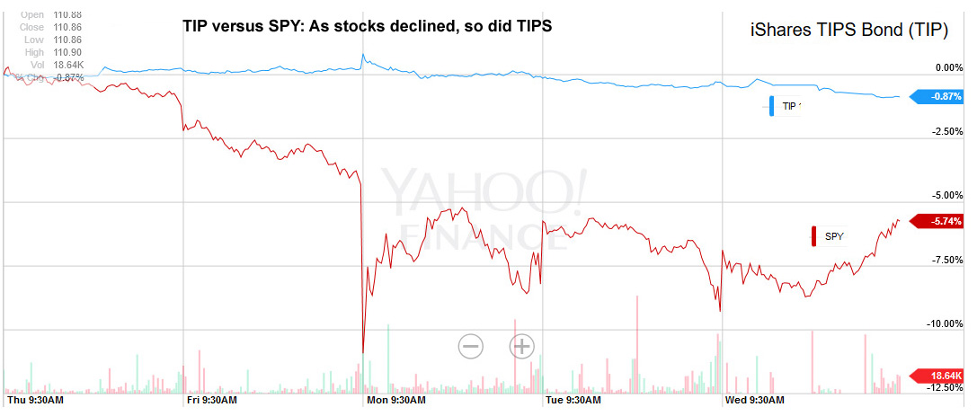 You can see in that chart that TIPS greatly outperformed the overall bond market for the remainder of 2011 (represented by the AGG ETF in red). But this time – the 2015 correction – that isn’t happening. As the stock market plummeted this week, TIPS values actually declined. And this chart shows that TIPS aren’t out-performing the overall bond market: