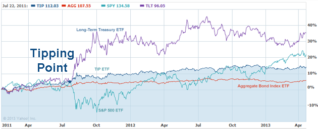 That article included this chart, showing the huge move up for Treasurys and TIPS which began at the exact moment the stock market plummeted (oddly enough, in reaction to Standard & Poors downgrading US Treasurys):
