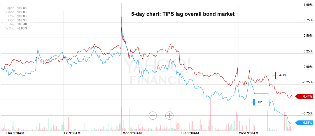 This chart shows the 5-day market results for TIPS, represented by the TIP ETF in blue, versus the overall stock market, represented by the SPY ETF in red: