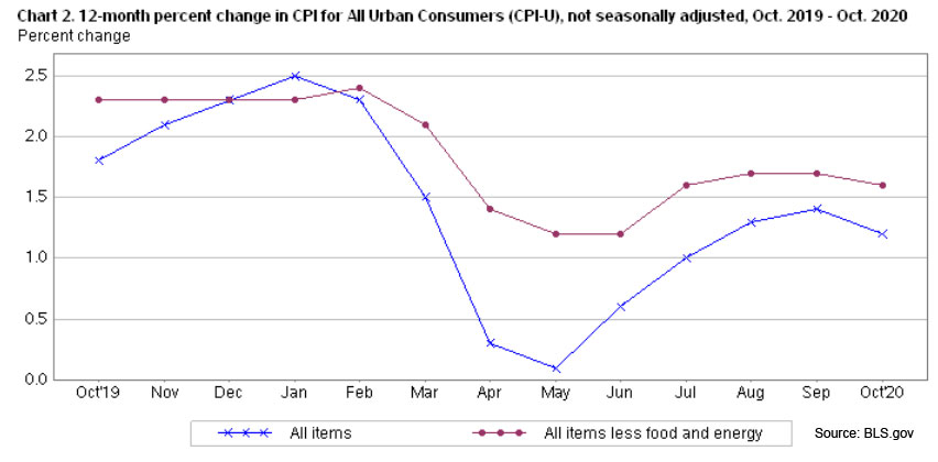 The Consumer Price Index for All Urban Consumers (CPI-U) was unchanged in October on a seasonally-adjusted basis, the U.S. Bureau of Labor Statistics reported today. Over the last 12 months, the all-items index increased 1.2%. Both of those numbers fell below the consensus estimates of 0.2% for the month and 1.3% for the year.