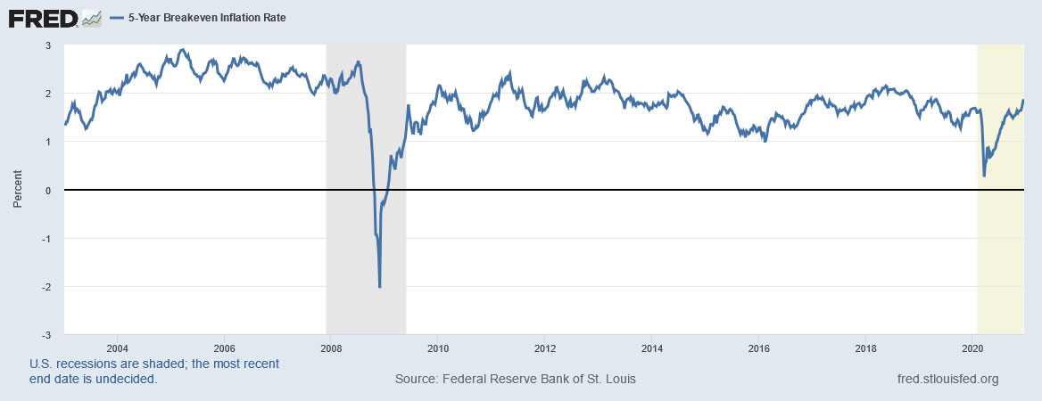 Here is the trend in the 5-year inflation breakeven rate back to 2003, showing that the current rate is now at a level that is historically typical, despite a decade of lower-than-expected inflation.