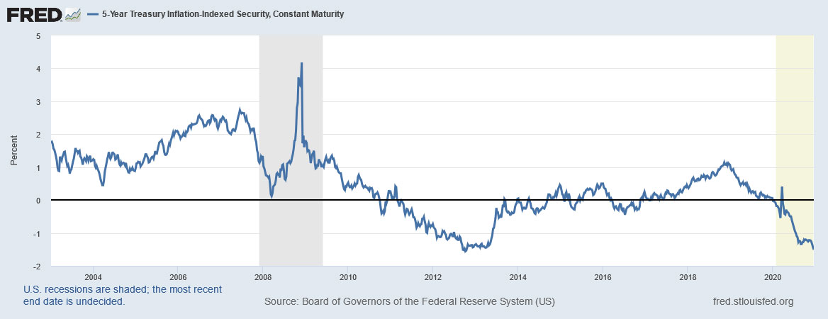 Negative real yields on TIPS haven’t been unusual since 2011, when the Federal Reserve began its aggressive quantitative easing programs. Another phase of QE started in March 2020, as the global pandemic set off chaos in the bond market. TIPS yields are likely to remain negative to inflation through 2021, and possibly beyond. Here’s a look at 5-year real yields going back to January 2003: