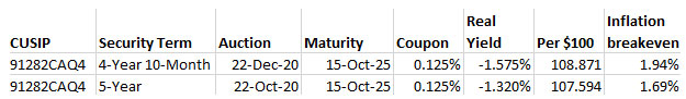 This was CUSIP 91282CAQ4, in a 4-year, 10-month version. It was born in an originating auction on Oct. 22, when it generated a real yield to maturity of -1.32%. The coupon rate was set at 0.125%, the lowest the Treasury will go for any TIPS.