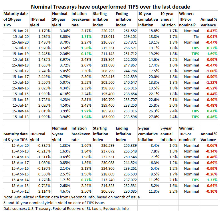 Inflation breakeven rates of less than 2.0% are noted in green. In general, TIPS out-perform nominal Treasurys when this happens. The 10-year TIPS that matured in July 2020 had only a rounding error (less than 0.1%) of difference.
