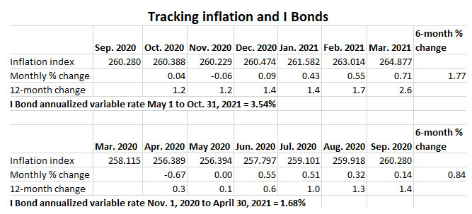 The I Bond’s new variable rate is based on a six-month inflation rate, in this case from September 2020 to March 2021. Non-seasonally adjusted inflation increased 1.77% over that period, which translates to a new six-month variable rate of 3.54%, annualized, for all I Bonds. That is a huge increase over the current rate of 1.68%.