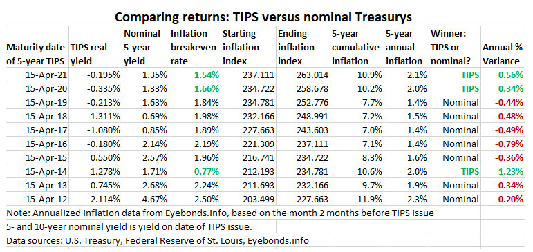 Wrong. It ended up outperforming a 5-year Treasury note, which at the time had a nominal yield of 1.35%. That created an inflation breakeven rate of 1.54%, pretty attractive. In actuality, inflation ended up averaging 2.1% over the next five years, giving this TIPS a 0.56% annual advantage over the nominal 5-year Treasury.