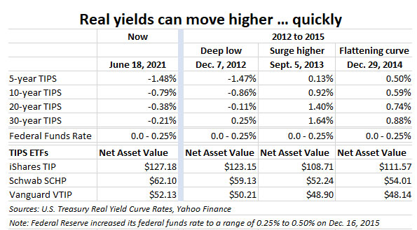 I’ve been thinking about how this “tapering” could affect the real yields and values of Treasury Inflation-Protected Securities. And I think the model to look at is a similar “talking about talking about” period from December 2012 to December 2014, when TIPS yields rose quickly from ultra-low levels. And all of this happened well before the Federal Reserve actually began tapering its bond buying or increasing short-term interest rates. We could be heading into a similar market trend for the remainder of 2021 and into 2022.