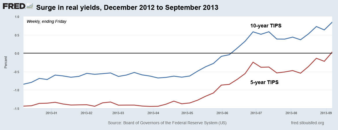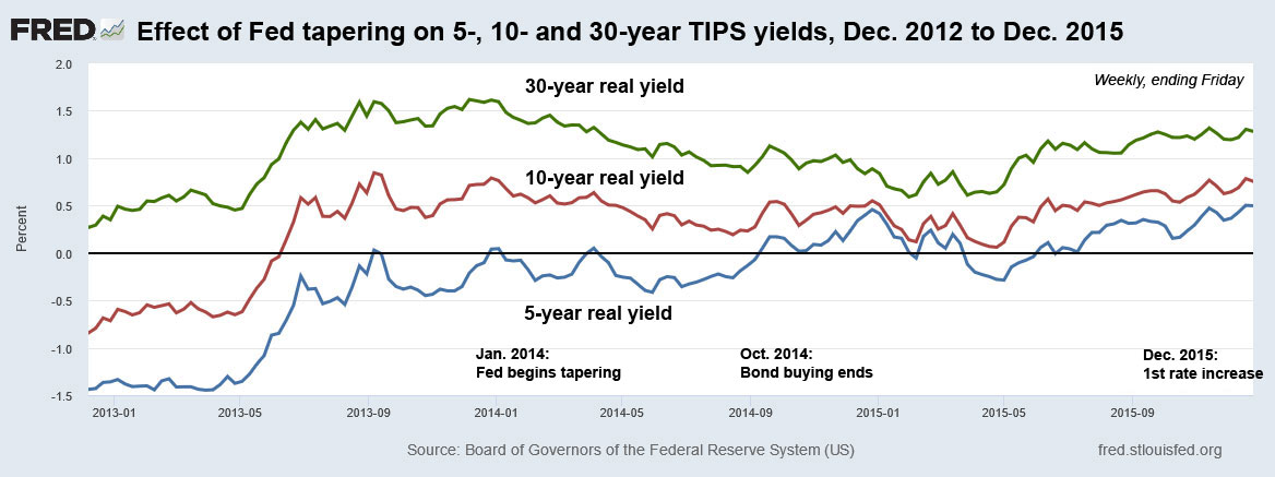 Here’s the important historical context to this chart: Ben Bernanke, then the Fed chairman, had hinted vaguely that tapering of bond buying could begin in 2013, but there was no official announcement until June 19, 2013. By that time, the real yield of a 10-year TIPS had already surged from -0.86% on Dec. 7, 2012, to 0.29% on June 19, 2013, an increase of 115 basis points in only 7 months.