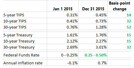 In reaction — and without the ballast of any Fed bond-buying program — real and nominal interest rates increased in 2015 across the board. The move higher was less drastic than we saw in 2013, but TIPS yields surged a bit higher than yields of nominal Treasurys. Here are the 2015 statistics: