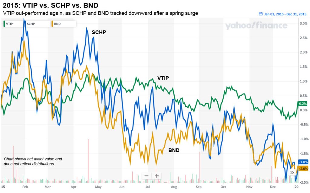 The TIPS market in December 2015 was actually very attractive for new purchases. A five-year TIPS reopening auctioned on Dec. 17, 2015 with a real yield of 0.472%, the highest in five years. This TIPS had original auctioned in April 2015 with a yield to maturity of -0.335%. So from April to December, the 5-year real yield surged 80 basis points higher. Great for investors, but bad for holders of TIPS funds.