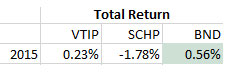 In reality, 2015 was not a disastrous year for TIPS or the bond market, even with the late-in-year increase in short-term interest rates. The Federal Reserve had done an excellent — and lengthy — job of signaling the increase, and the bond market handled it without any sort of “tantrum.” For most bond investors, it was a flat year, as reflected by the 0.56% total return of the total bond market.