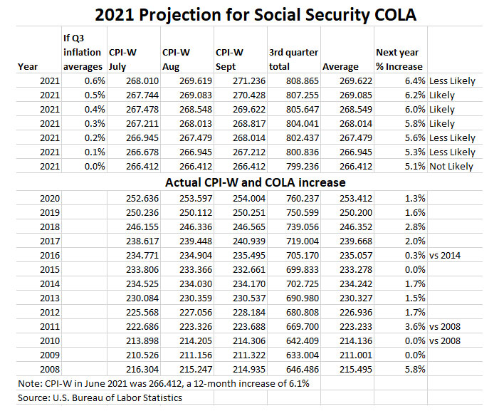 We won’t know the actual COLA number until 8:30 a.m. EDT on October 13, 2021, when the Bureau of Labor Statistics releases the September inflation report and completes the data needed for the 3rd quarter average of CPI-W. I will be tracking these numbers for July, August and September as each inflation report is issued.