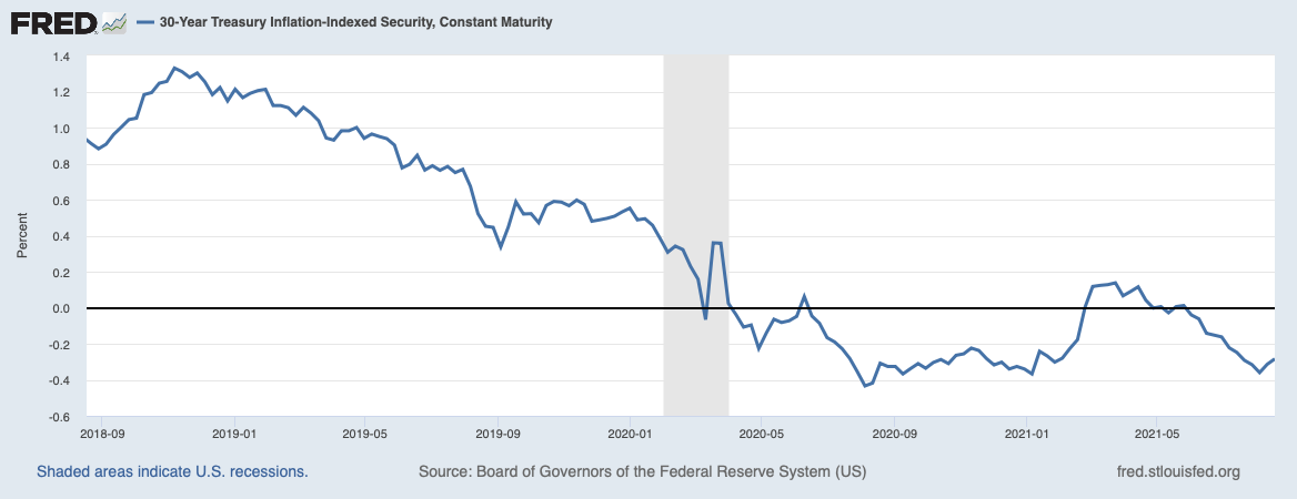 Here is the trend in 30-year real yields over the last two years, showing the dramatic move lower in the wake of the Federal Reserve intervention beginning after the COVID-19 surge in March 2020 and continuing today: