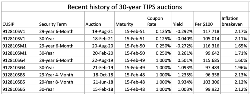 This auction closes the books on CUSIP 912810SV1, the only 30-year TIPS in history to get a coupon rate of 0.125%. Here the history of 29- to 30-year TIPS auctions from 2018 to 2021:
