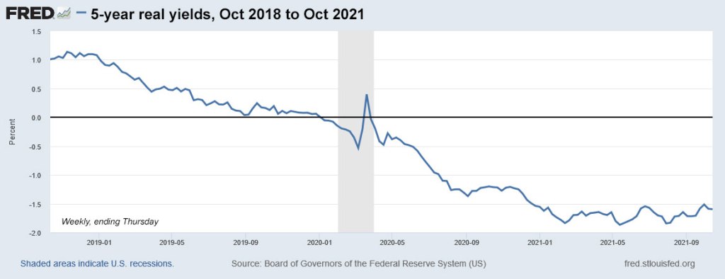 Here is the trend in 5-year real yields over the last three years, showing the deep dive into negative yields after the Federal Reserve began aggressive bond-buying in March 2020. Next month, in November, the Fed intends to begin tapering away from that bond buying, a many-months process that should cause real yields to climb. But so far, the 5-year real yield has stabilized in a range of about -1.50% to -1.60%.