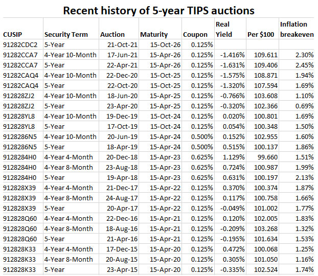 I will be reporting the auction results soon after the close at 1 p.m. Thursday. Non-competitive bids have to be placed by noon. Here’s a listing of recent TIPS auctions of this term, showing the six consecutive auctions with negative real yields, starting in April 2020, as the Fed began aggressively buying Treasurys.