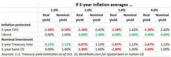 As I noted above, the U.S. Treasury on Friday estimated a full-term 5-year TIPS would have a real yield of -1.58%. While that sounds miserable, it is in line with other high-safety nominal investments, for example the 5-year Treasury note or an insured 5-year bank CD. Here’s a comparison, showing how a 5-year TIPS will under-perform a nominal Treasury under low inflation scenarios, but easily out-perform the Treasury note if inflation averages 3.0% to 4.0% or higher in the next five years: