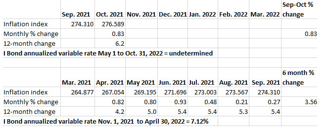 For I Bonds. The October report is the first in a six-month period (October to March) that will determine the I Bond’s new inflation-adjusted variable rate, which will be reset May 1, 2022. After just a month, inflation has increased 0.83%, which translates to a variable rate of 1.66%. The current variable rate is 7.12%, based on inflation from April to September 2021.