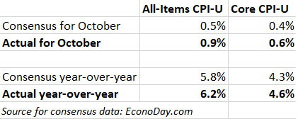 Core inflation, which removes food and energy, rose 0.6% in October and 4.6% year of year. Those results also greatly exceeded consensus estimates of 0.4% for the month and 4.3% for the year.