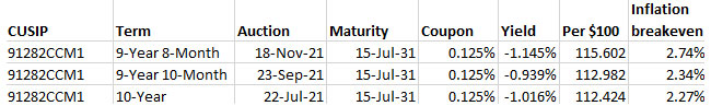 Reopening auction, Sept, 23, 2021: The real yield at this auction bounced higher, to -0.939%, again spurred by Fed statements the day before indicating actions to slow its bond-buying program. The inflation breakeven rate was 2.34%.