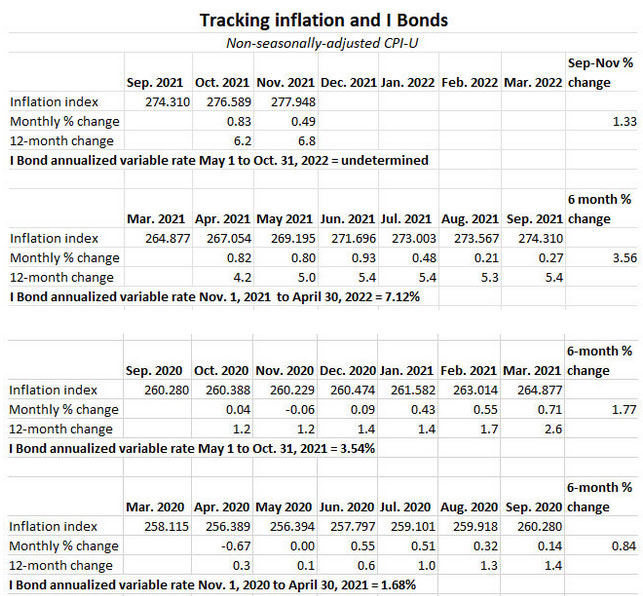 To start the year, through April 2021, I Bonds had a rather mundane six-month inflation-adjusted rate of 1.68%, but that jumped to a much more attractive 3.54% on May 1 and then to the wow-factor rate of 7.12% on November 1. The reason? U.S. inflation rose 3.56% in the six months from March to September 2021, the highest six-month increase in the 23-year history of I Bonds.
