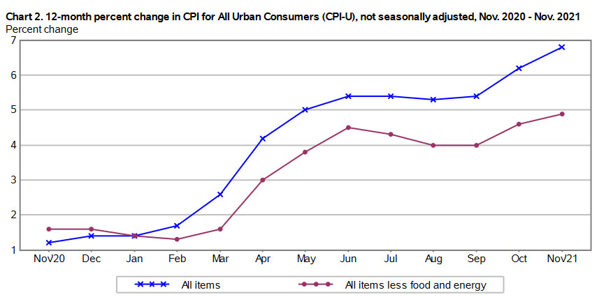 In January 2021, U.S. inflation was running at an annual rate of 1.4%, continuing an 11-month string with annual inflation under 2.0%. But 11 months later, by November 2021, annual inflation had soared to 6.8%, the highest rate in 39 years. And it shows no sign of waning anytime soon. Here is the trend in annual inflation over the last year: