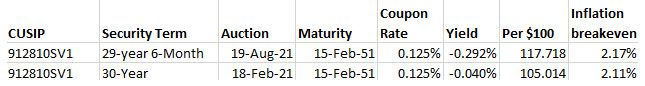Original auction, Feb. 18, 2021: This new 30-year TIPS auctioned with a real yield to maturity just slightly negative to inflation, at -0.04%, to fairly weak investor demand. The coupon rate of 0.125% became the record low for any 30-year TIPS auction in history. The inflation breakeven rate was 2.11%. All in all, this ended up being a fairly attractive auction, especially for TIPS traders.